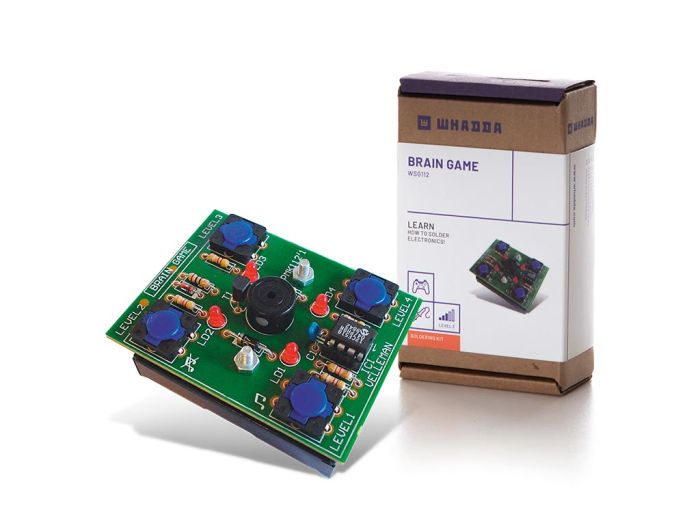 Deze kit stelt je in staat om je eigen elektronische “geheugenspel” te bouwen. Door de onderdelen zelf te solderen, monteer je een werkend spel dat geheugen en reactiesnelheid test: LEDs en knoppen worden gecombineerd in een circuit dat je kunt programmeren en bedienen, afhankelijk van de gekozen opstelling